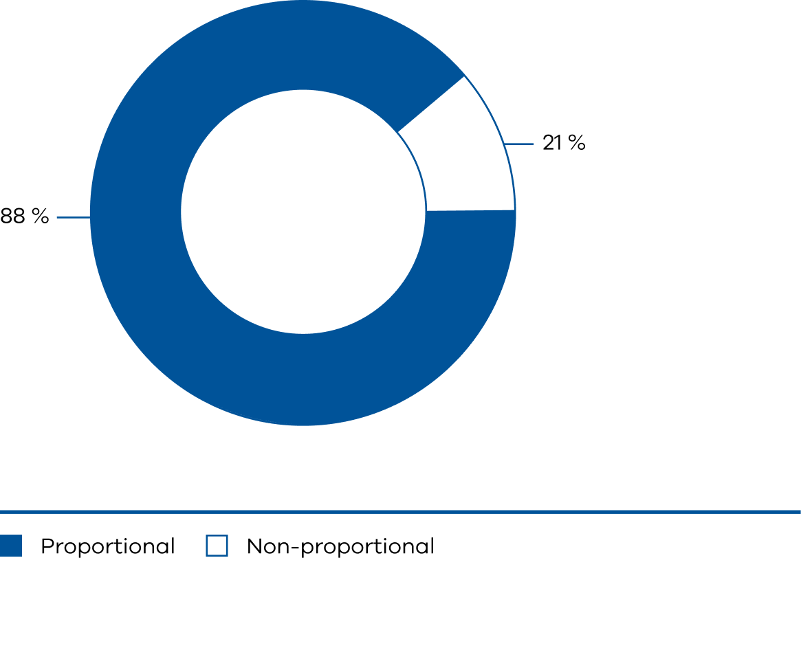 Die folgenden Diagramme veranschaulichen die Aufteilung der Prämie nach Zedent, Sparte und Vertragsart im Geschäftsjahr 2024.